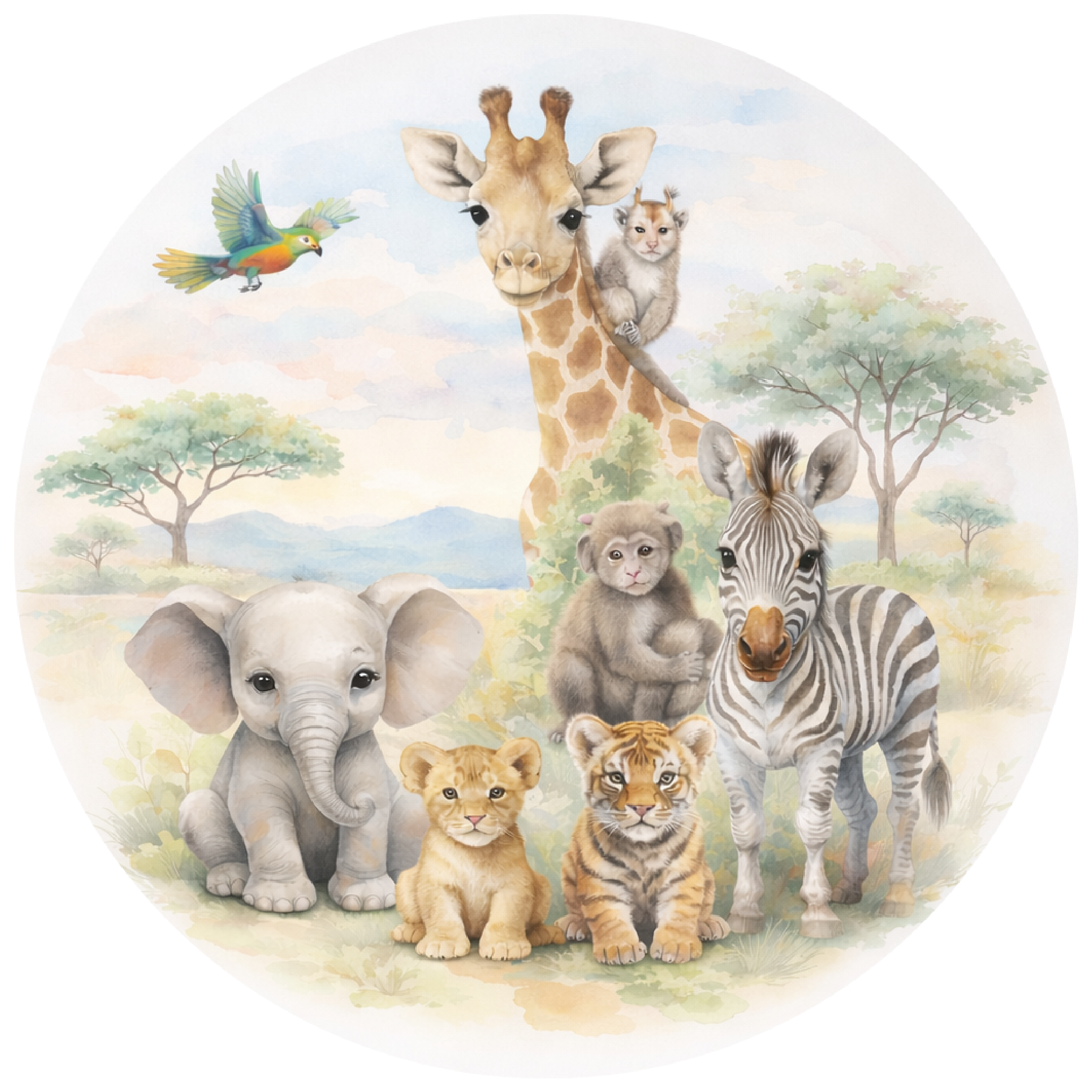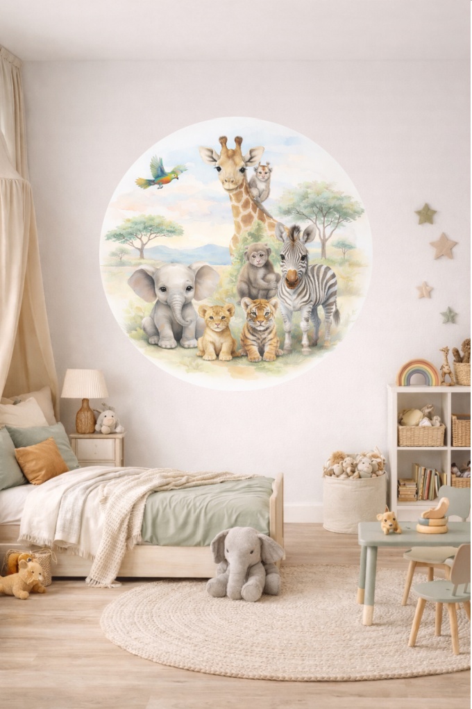 Deze prachtige behangcirkel met safari babydieren brengt meteen een rustige en warme sfeer in de kinderkamer. In het midden van de illustratie staat een vriendelijke giraffe, omringd door lieve dieren zoals een olifantje, zebra, leeuwenwelpje en een tijger. Boven de dieren vliegt een kleurrijke papegaai terwijl een klein aapje speels bij de giraffe zit.