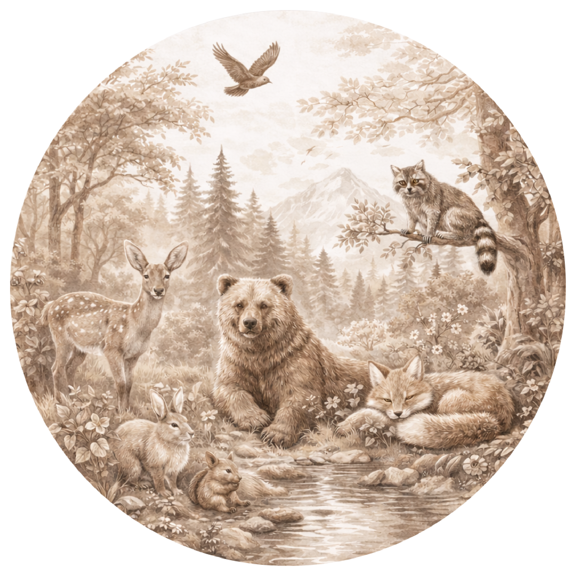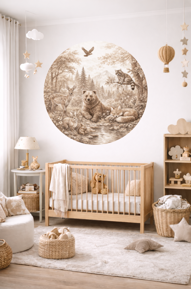 De zachte sepia tinten en natuurlijke kleuren maken deze behangcirkel perfect voor een rustige babykamer of kinderkamer. De illustratie heeft een warme, zachte uitstraling waardoor hij mooi past bij houten meubels, beige tinten en een natuurlijke inrichting.