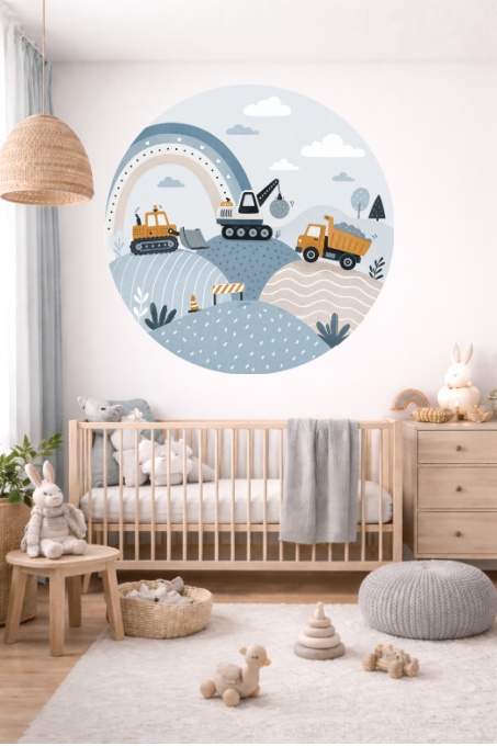 Waarom deze bouwvoertuigen behangcirkel zo mooi staat in een kinderkamer