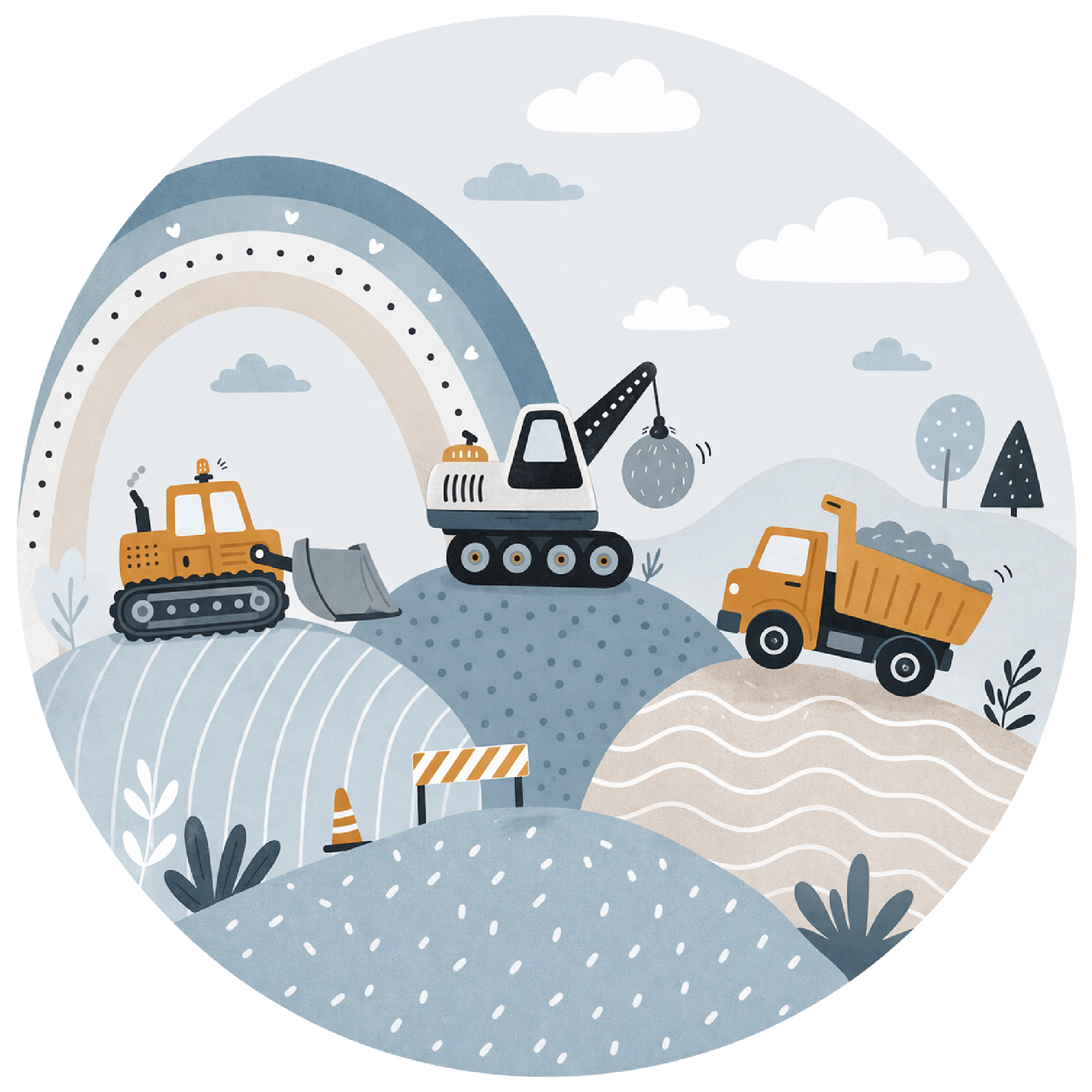 Deze prachtige behangcirkel met bouwvoertuigen brengt meteen een stoere en tegelijk rustige sfeer in de kinderkamer. Op de illustratie zie je drie verschillende bouwvoertuigen, zoals een bulldozer, graafmachine en kiepwagen, die speels over zachte heuveltjes rijden. Op de achtergrond zorgt een subtiele regenboog en lichte wolkjes voor een rustige en vriendelijke uitstraling.