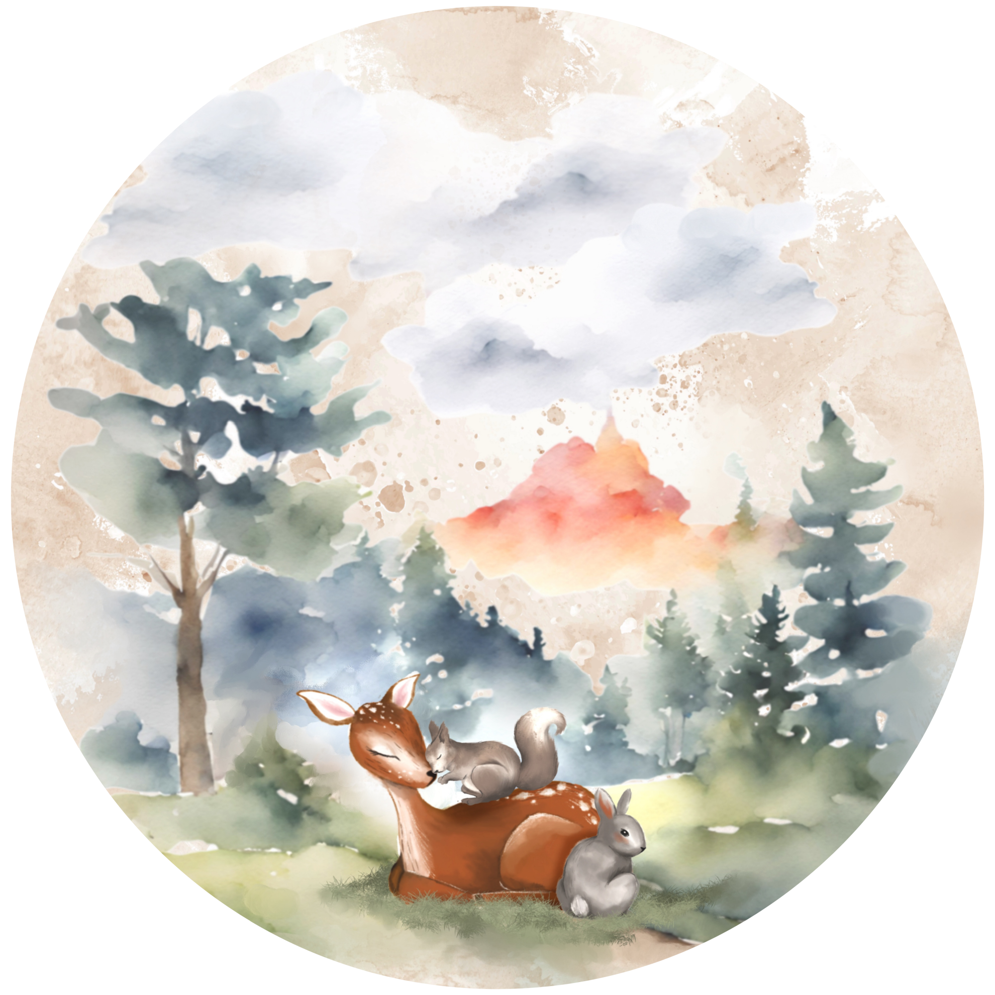 In deze serene setting wordt een hartverwarmende vriendschap bezegeld. Een majestueus hert, de koning van het bos, omarmt zachtjes een schattige eekhoorn en een pluizig konijntje. Hun samenzijn straalt een gevoel van geborgenheid uit, waardoor je kind zich veilig en geliefd voelt in hun eigen ruimte.