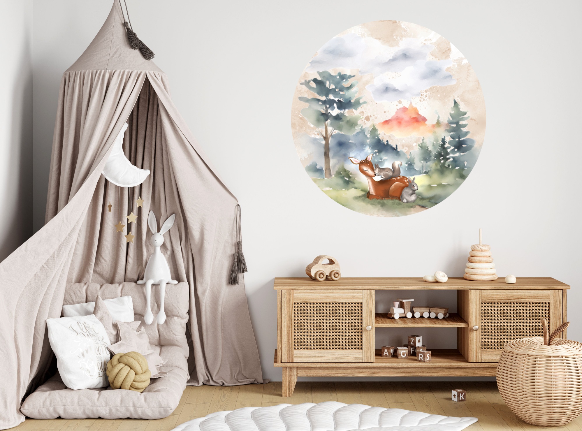 Natuurlijke schoonheid komt tot leven in de kinderkamer met onze betoverende behangcirkel, een ware ode aan het bosleven. Laat je kleintje wegdromen te midden van de rustgevende groene bladeren, terwijl een liefdevol tafereel zich ontvouwt voor hun ogen.
