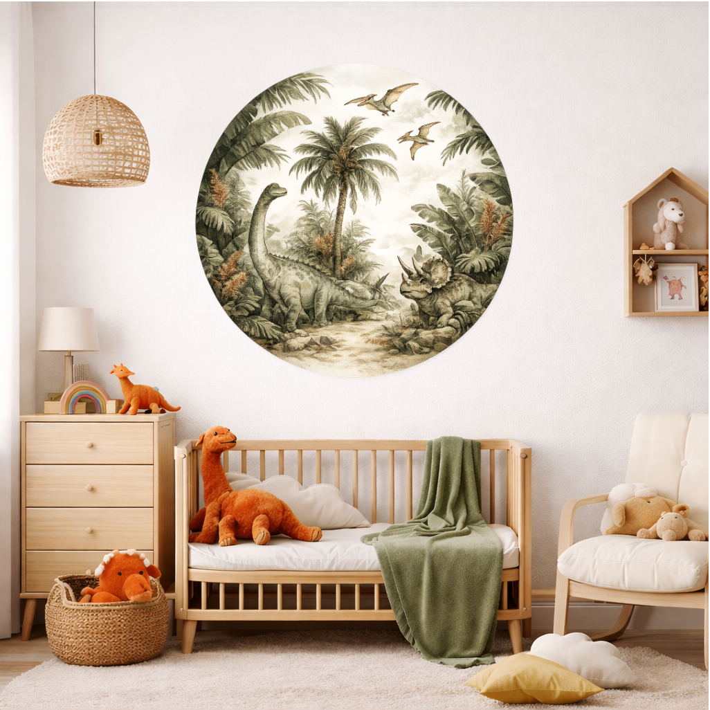 Deze behangcirkel met dinosaurussen brengt een rustige jungle sfeer naar de kinderkamer. Tussen de palmbomen en bladeren lopen twee vriendelijke dino’s terwijl boven hen pterosaurussen door de lucht vliegen. De zachte groen- en zandtinten zorgen ervoor dat de behangcirkel perfect past in een rustige, natuurlijke kinderkamer.