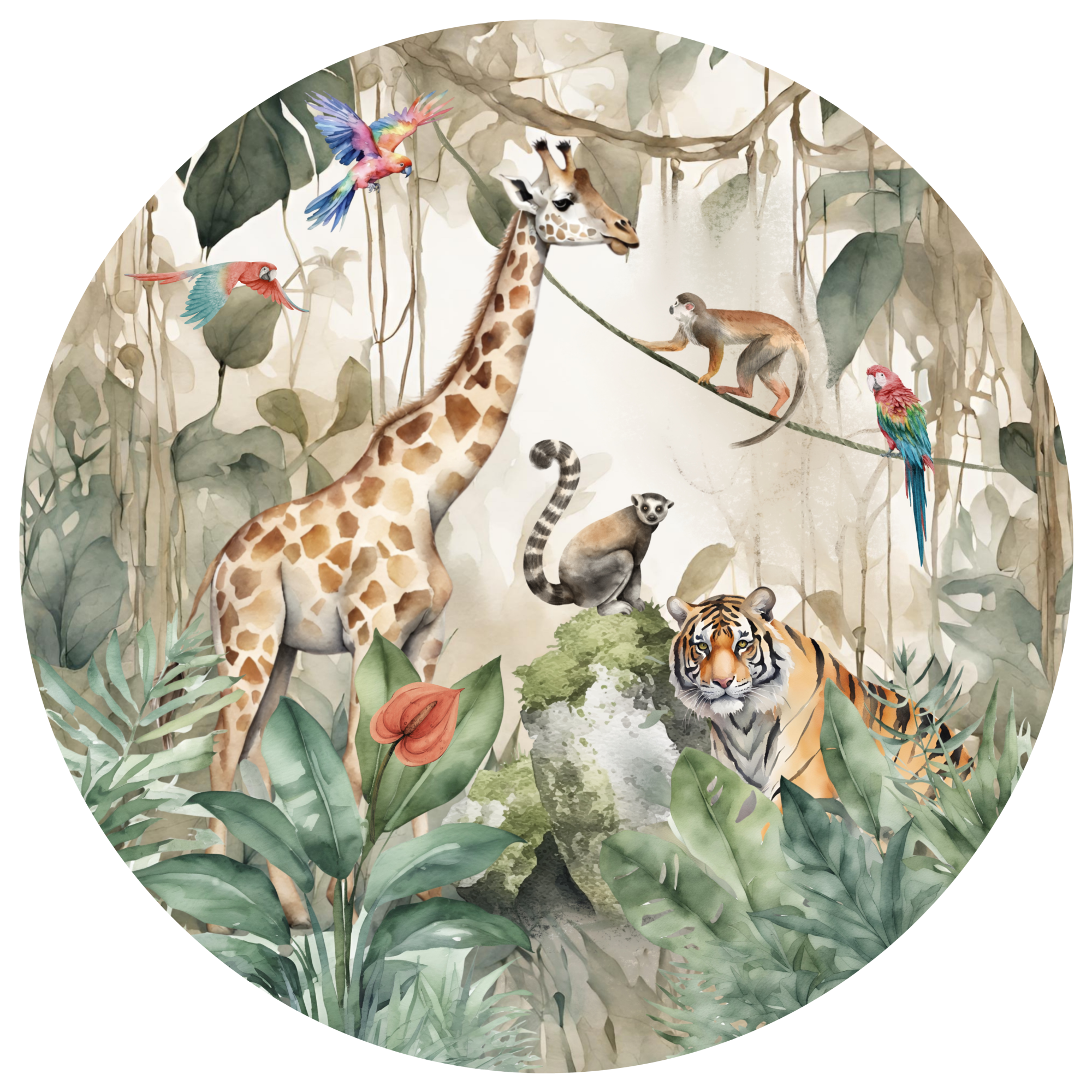 Ontdek een wereld vol avontuur met onze prachtige behangcirkel met een jungle thema, speciaal ontworpen voor de kinderkamer. Deze unieke muurdecoratie brengt een levendig stukje natuur naar binnen en creëert een spannende en inspirerende omgeving voor jouw kleintje.