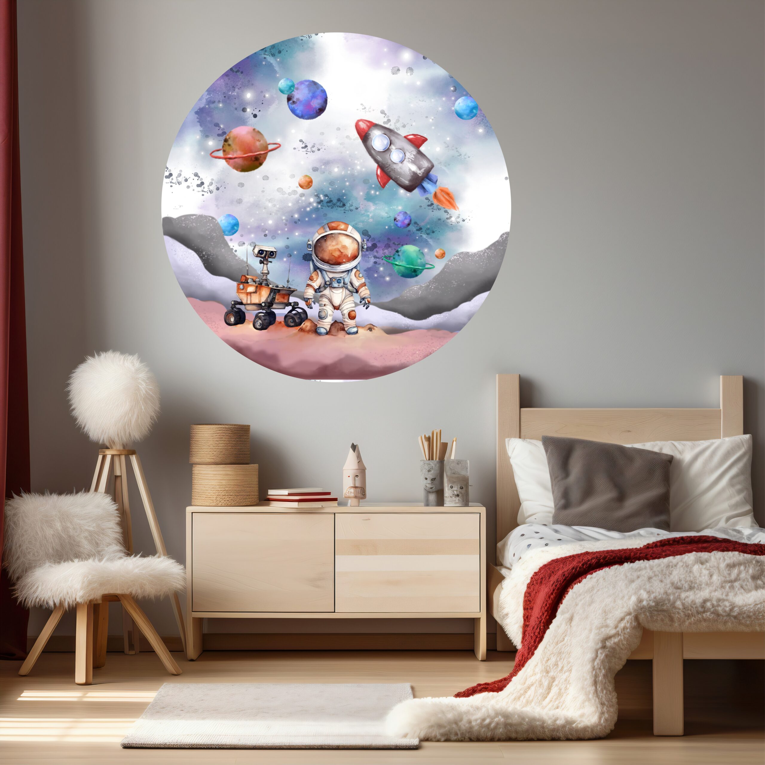 Stap de kosmos binnen met onze behangcirkel voor de kinderkamer, waar een dappere astronaut, een kleurrijke raket en betoverende planeten wachten om de verbeelding van je kind te inspireren. Deze levendige en educatieve muurdecoratie brengt de schoonheid van de ruimte rechtstreeks naar hun eigen kleine wereld.