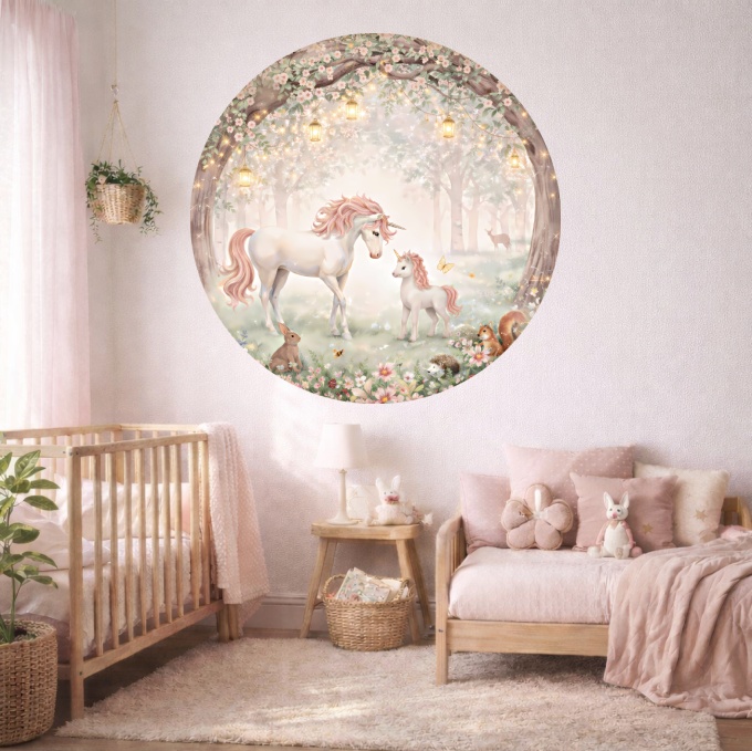 In een zacht, dromerig bos staan een lieve mama unicorn en haar baby samen tussen bloemen, vlinders en kleine bosdiertjes. De pastel kleuren en rustige achtergrond zorgen voor een warme, magische sfeer in de kamer. Perfect voor kleine unicorn fans die dol zijn op sprookjesachtige avonturen.