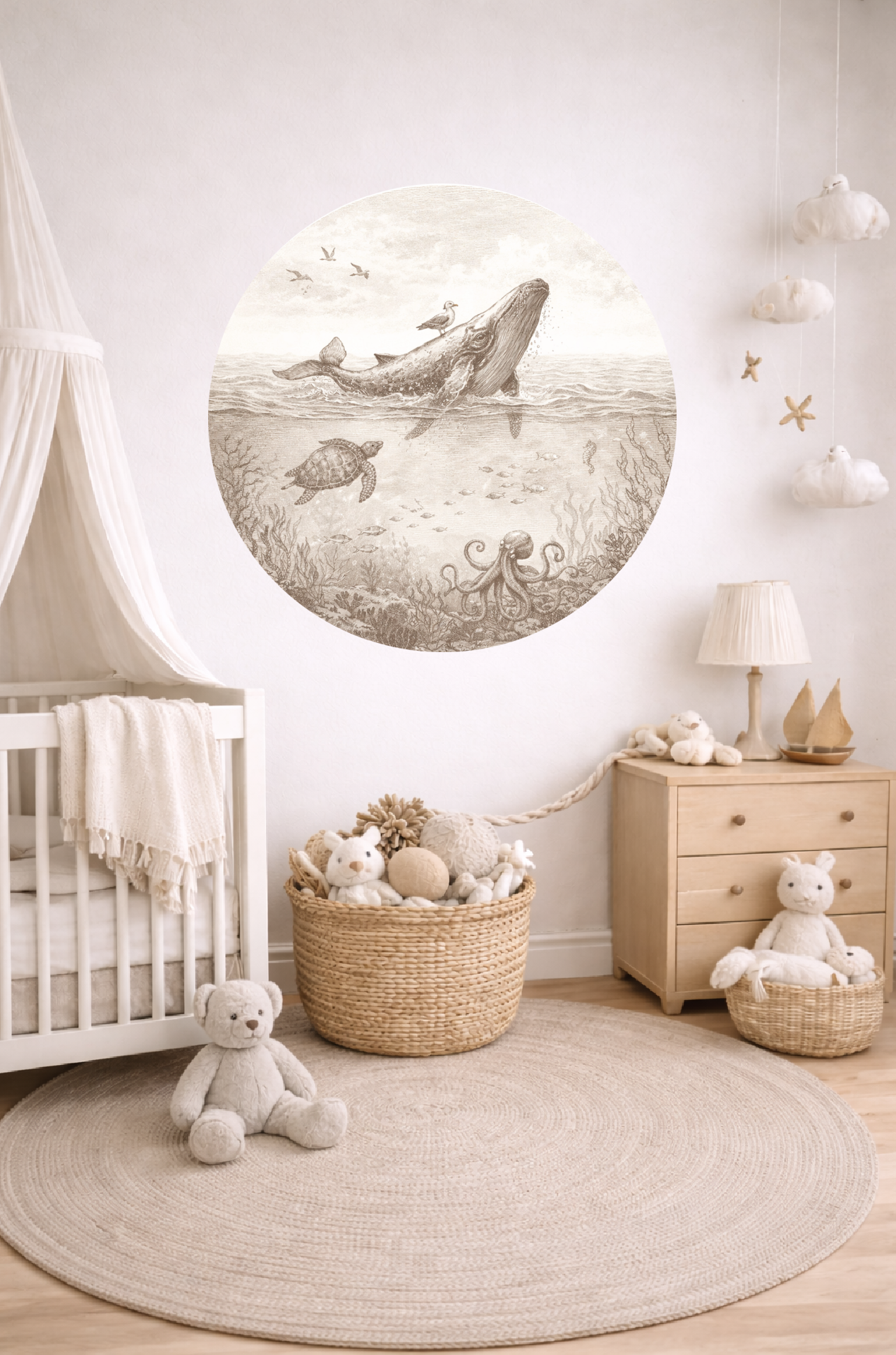 Breng rust en warmte in de babykamer met deze stijlvolle behangcirkel met walvis in sepia tinten.