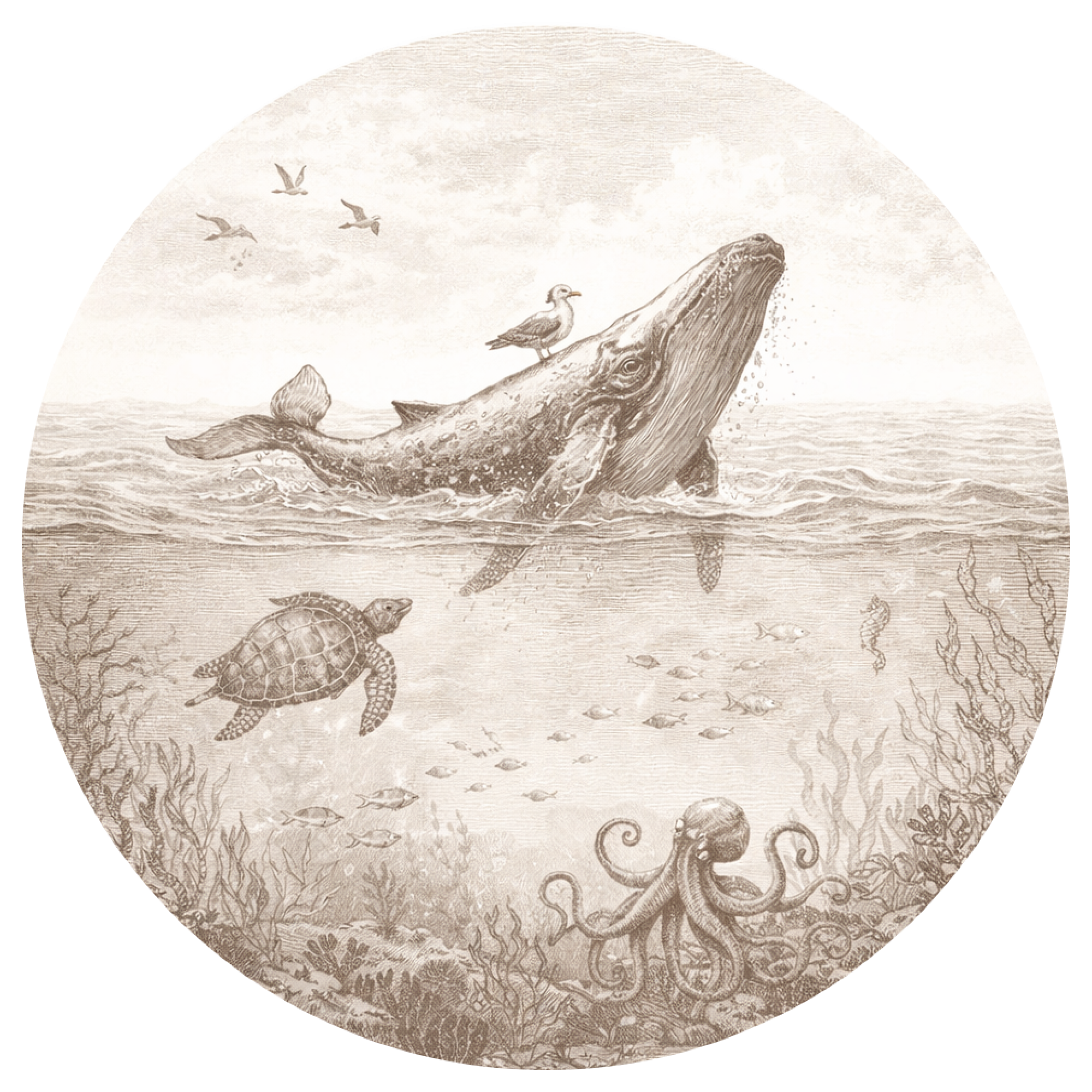 Behangcirkel Walvis – Sepia Oceaan Illustratie