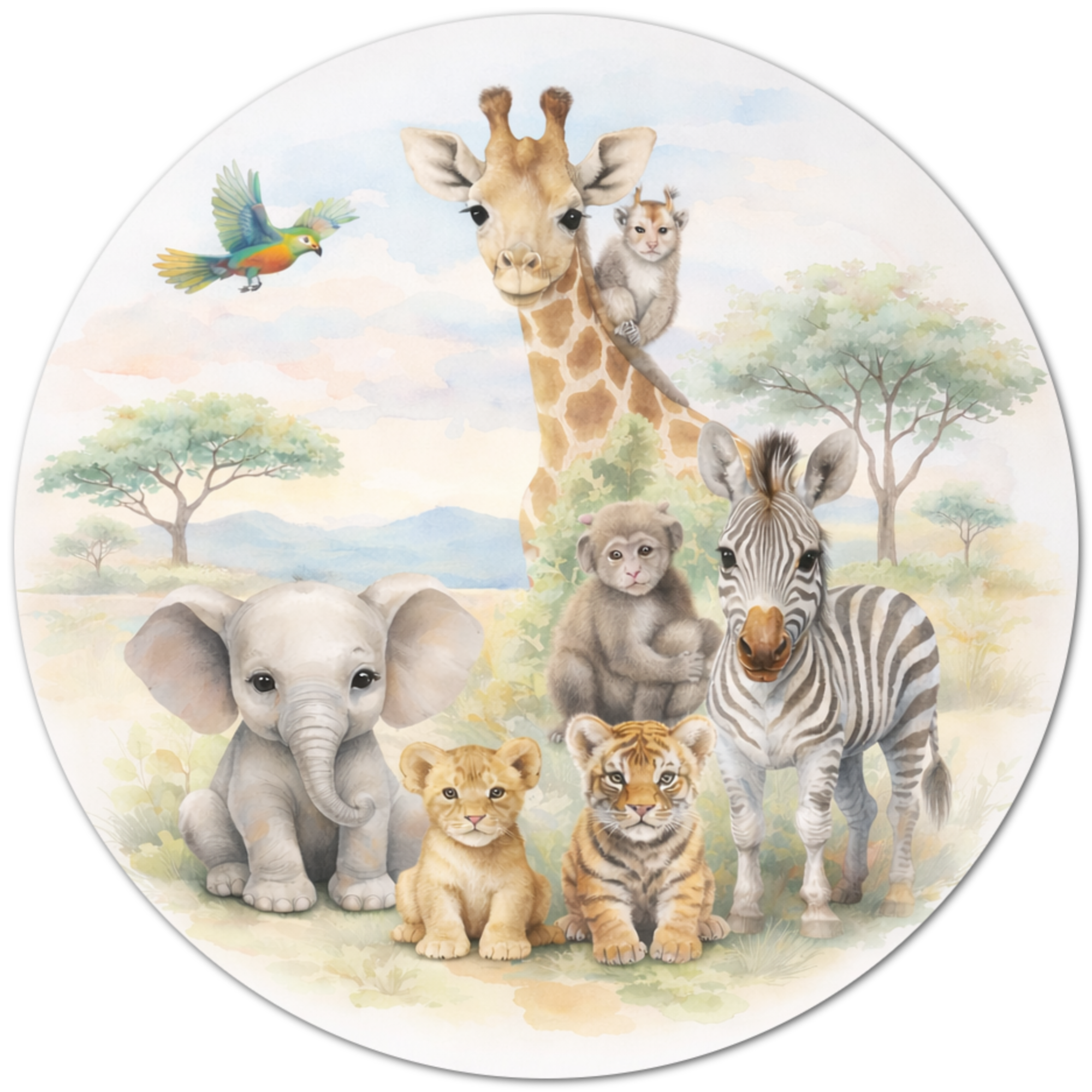 Deze prachtige muurcirkel met safari babydieren brengt meteen een rustige en warme sfeer in de kinderkamer. In het midden van de illustratie staat een vriendelijke giraffe, omringd door lieve dieren zoals een olifantje, zebra, leeuwenwelpje en een tijger. Boven de dieren vliegt een kleurrijke papegaai terwijl een klein aapje speels bij de giraffe zit.
