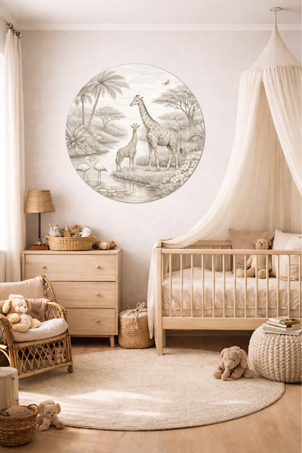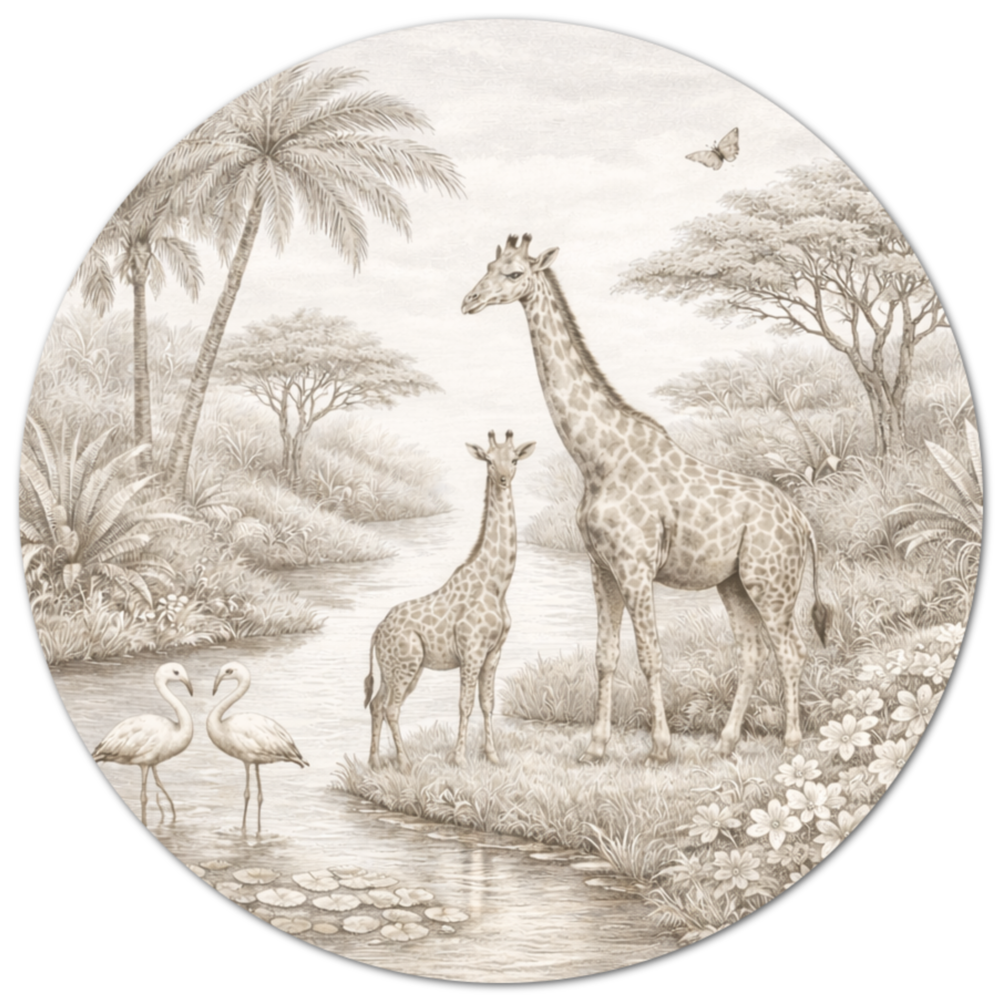 Deze sepia muurcirkel met giraffe brengt rust, warmte en een vleugje jungle in de baby- of kinderkamer.
