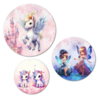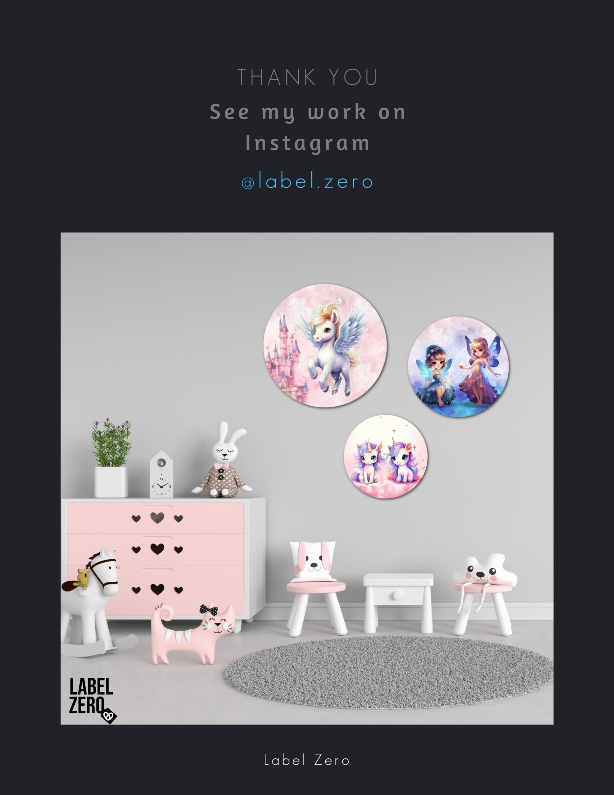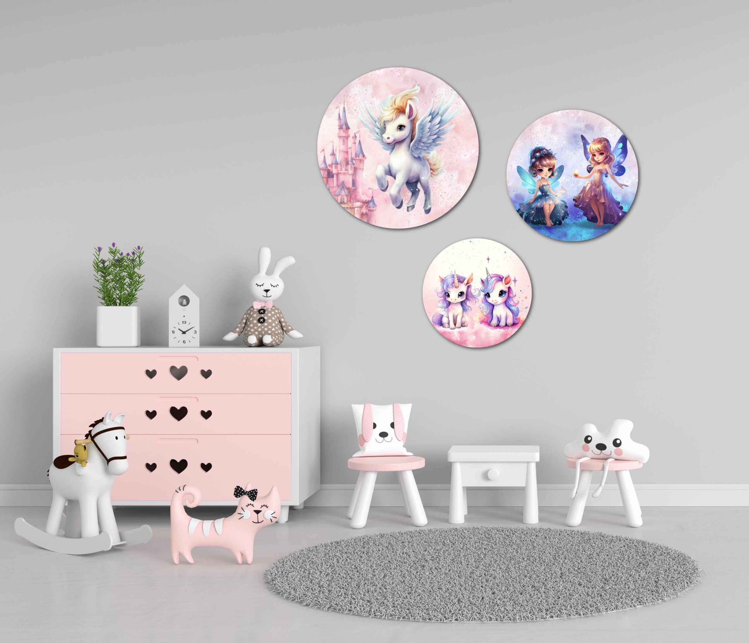 Creëer een betoverende sfeer in de kinderkamer met onze prachtige set van drie muurcirkels, elk voorzien van een uniek ontwerp: een majestueuze pegasus, charmante elfjes en prachtige eenhoorns. Deze set is perfect om de verbeelding van kinderen te stimuleren en hun kamer om te toveren in een droomwereld vol avontuur en vrolijkheid.