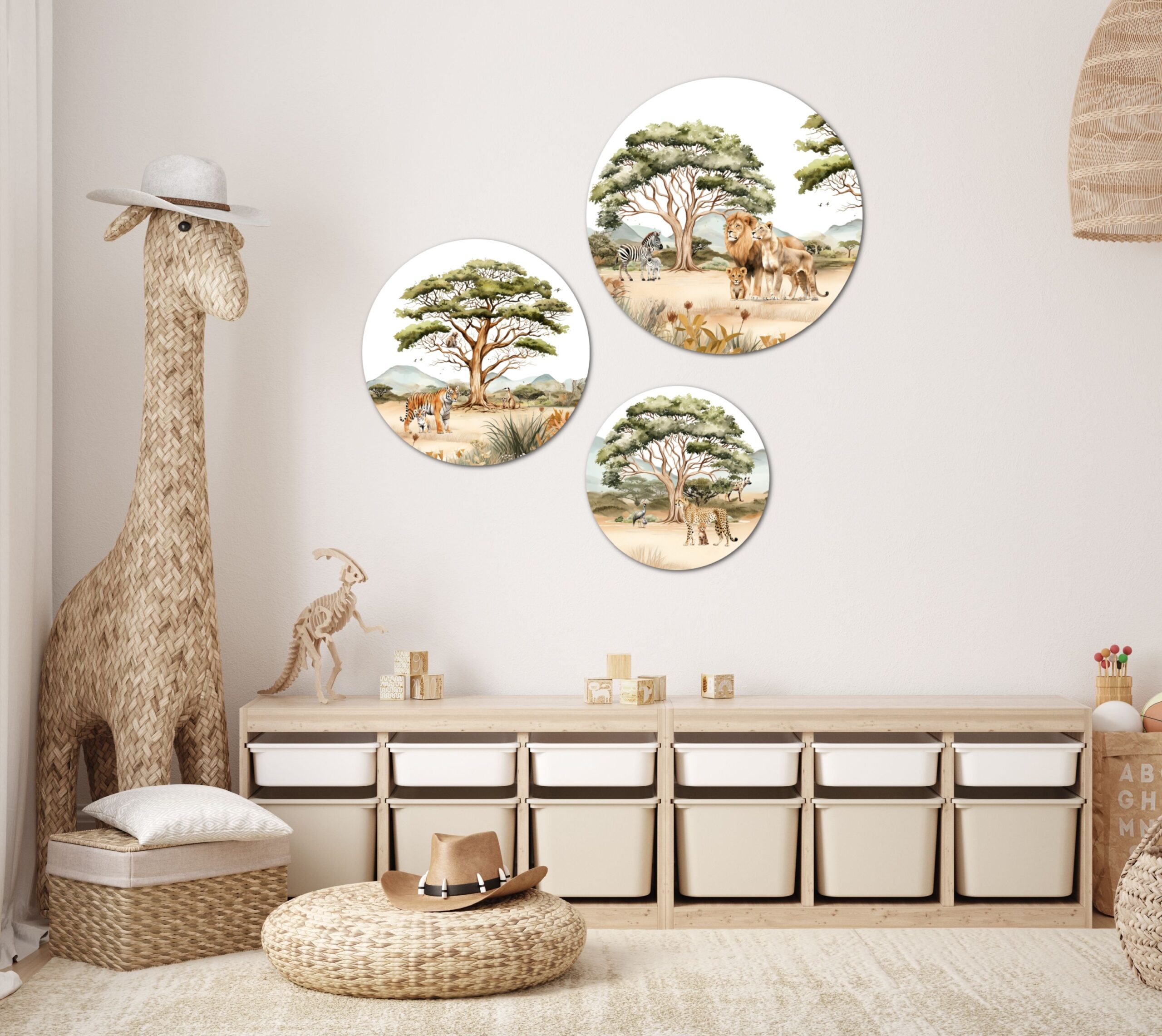 Deze muurcirkels met savannetafereel is niet alleen een visueel aantrekkelijk stuk, maar het kan ook dienen als inspiratiebron voor verhalen en spelletjes. Het stimuleert de verbeelding van kinderen en biedt hen de mogelijkheid om meer te leren over de fascinerende wereld van wilde dieren. Ideaal voor jonge ontdekkingsreizigers die dromen van avonturen in verre landen.