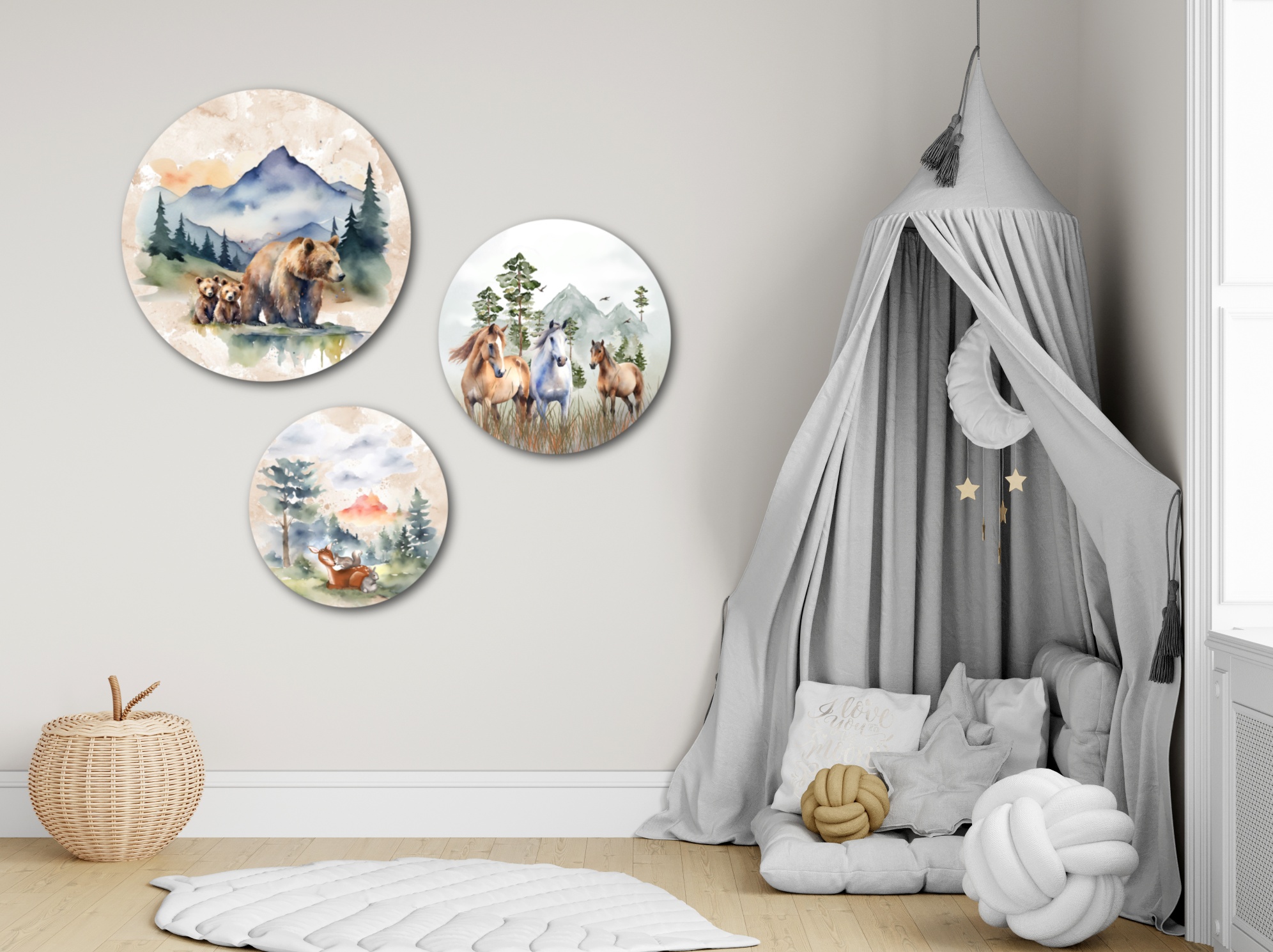 Laat je betoveren door de krachtige beren, met hun imposante gestalte en speelse sprongen tussen de bomen. Bewonder de gratie van de elegante paarden, die dansen door de weiden met de wind in hun manen. En ontmoet het zachte hert, symbool van schoonheid en tederheid, dat de rust van het bos belichaamt.