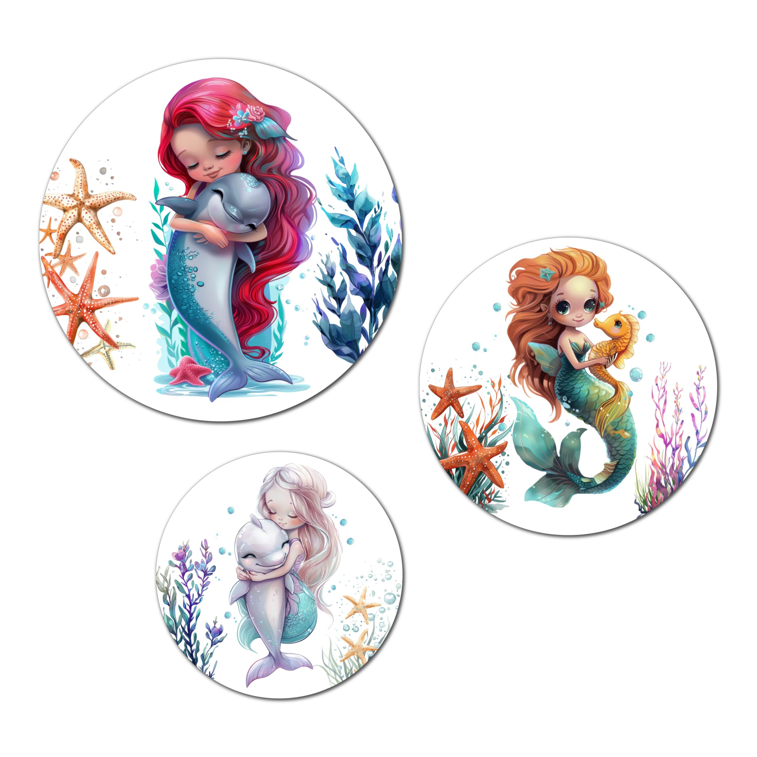 Hoe mooi zijn deze spetterende zeemeerminnen muurcirkels voor op de baby / kinderkamer? Deze set is een mooie kleurrijke decoratie voor aan de muur. Het is een exclusief ontwerp, dus verder nergens te vinden! De set bestaat uit 3 verschillende muurcirkels.