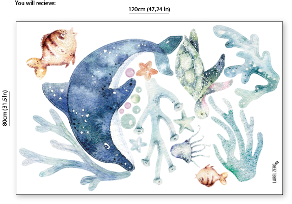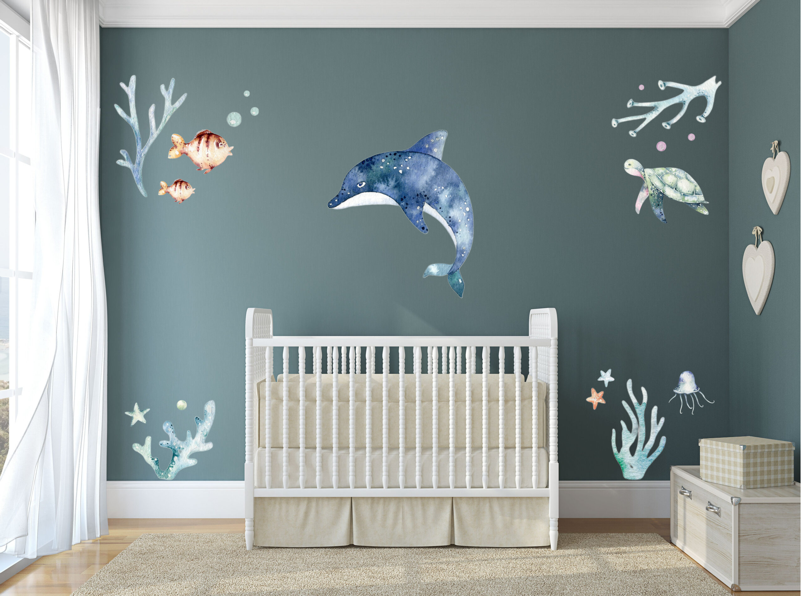 De muursticker met zeedieren is een leuke manier om de baby/kinderkamer op te vrolijken. Stijl de kamer aan de hand van het voorbeeld of leef jezelf uit 🙂