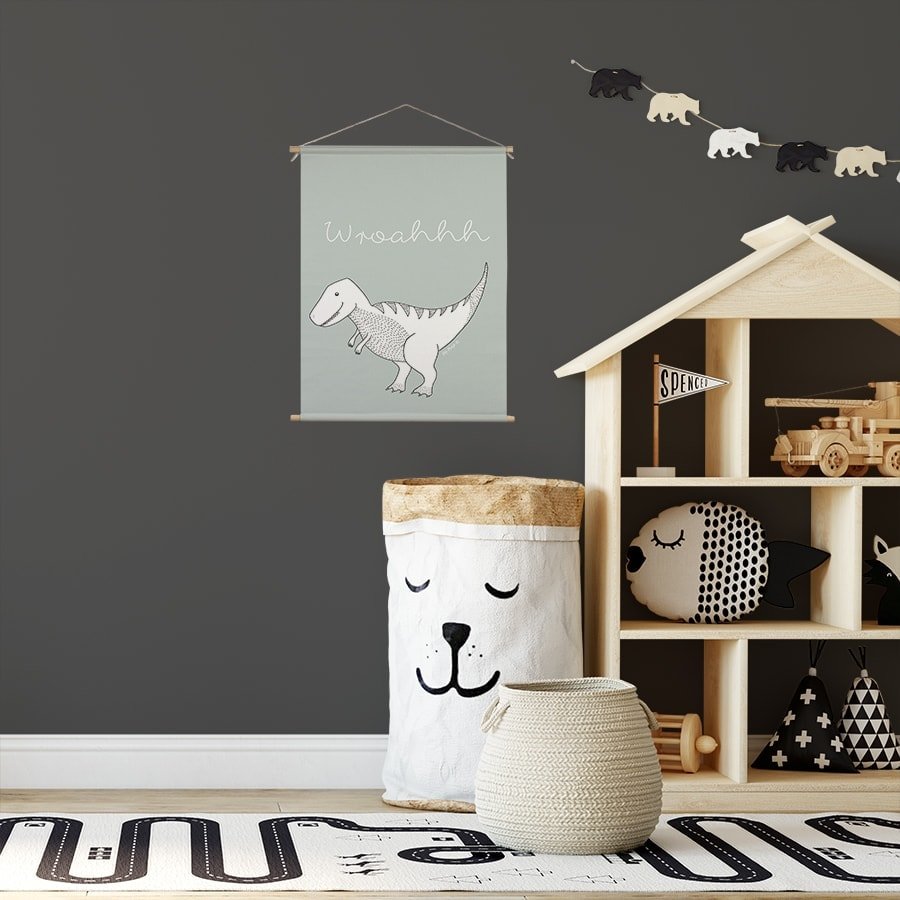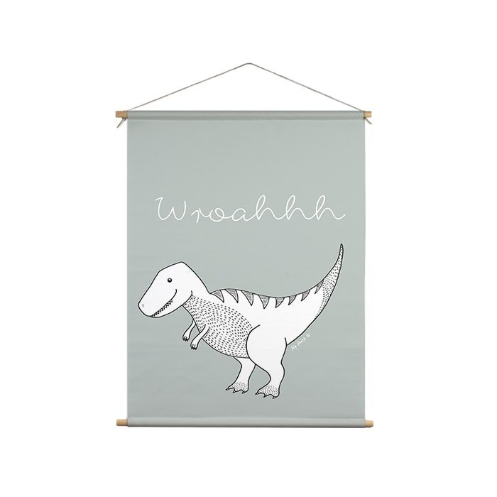 Stoere textielposter dino voor babykamer / kinderkamer. Deze textielposter met dino print staat erg stoer op je babykamer / kinderkamer. Een aanrader voor alle dino fans!